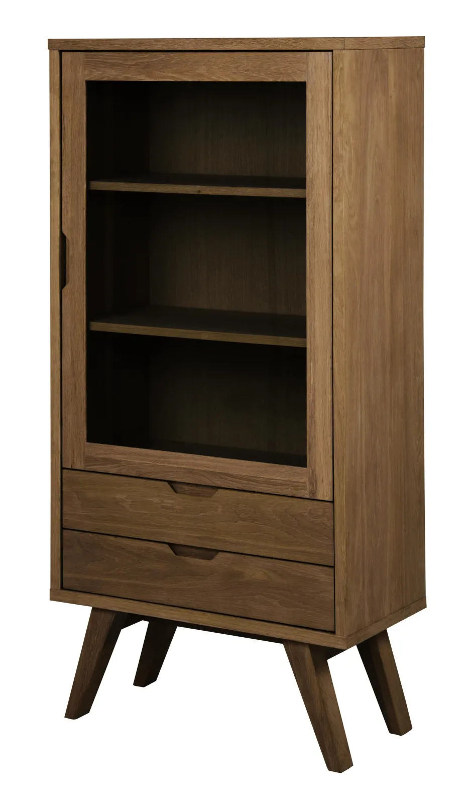 Maak kennis met een vitrinekast die royale opbergruimte biedt en ook nog een beetje Scandinavische stijl met zich meebrengt. De kast is gemaakt van gerookt, gelakt eikenfineer en is ontworpen met een dik frame en poten voor een flatteuze stoere look. Met 2 lades en 2 legplanken achter de doorzichtige glazen deur is organiseren een fluitje van een cent.
