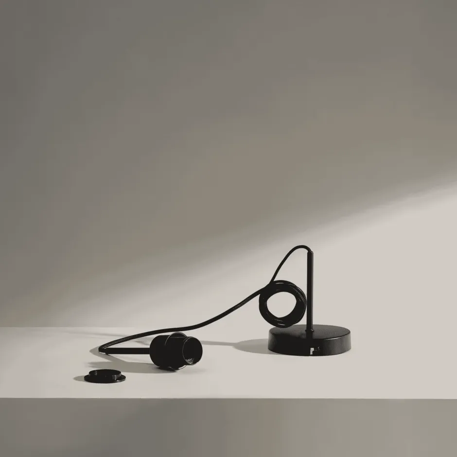 - Plafondlamphouder van metaal met zwarte afwerking. Zwarte plastic kabel 1,50 m.