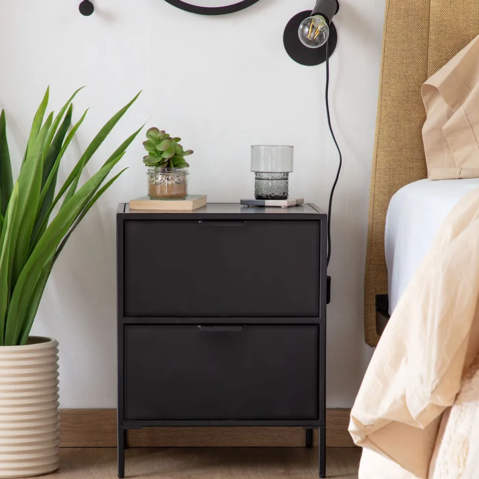 Nachtkastje ontworpen door Xavier Corcoy, van het Kave Home-team, voor de Shantay-collectie. Ideaal voor liefhebbers van de industriële trend en kleine ruimtes. Nooit eerder was de donkere kant zo licht van stijl.