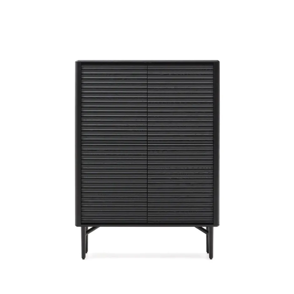- Hoog dressoir gemaakt van massief eiken en eiken fineer. Uniek design met afgeronde hoeken en deuren met reliëf.