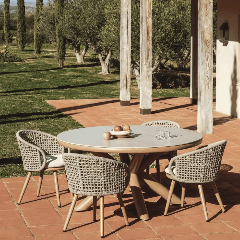 De Mirtia tafel combineert resistente materialen met warme afwerkingen in een meubel dat is ontworpen om genieten van de buitenlucht. Het tafelblad van gesinterde steen biedt een grote bestendigheid en een zacht aanvoelend oppervlak dat waterdicht is en bestand tegen krassen, vlekken en extreme temperaturen. De aluminium structuur met een afwerking in houteffect biedt lichtheid en stabiliteit, terwijl de visuele warmte van hout behouden blijft. Elk detail is verzorgd, zelfs de plastic beschermers onder de poten, die de vloer beschermen. Mirtia combineert functionaliteit en design in een tafel die uitnodigt om momenten buiten te delen in balans met de omgeving.