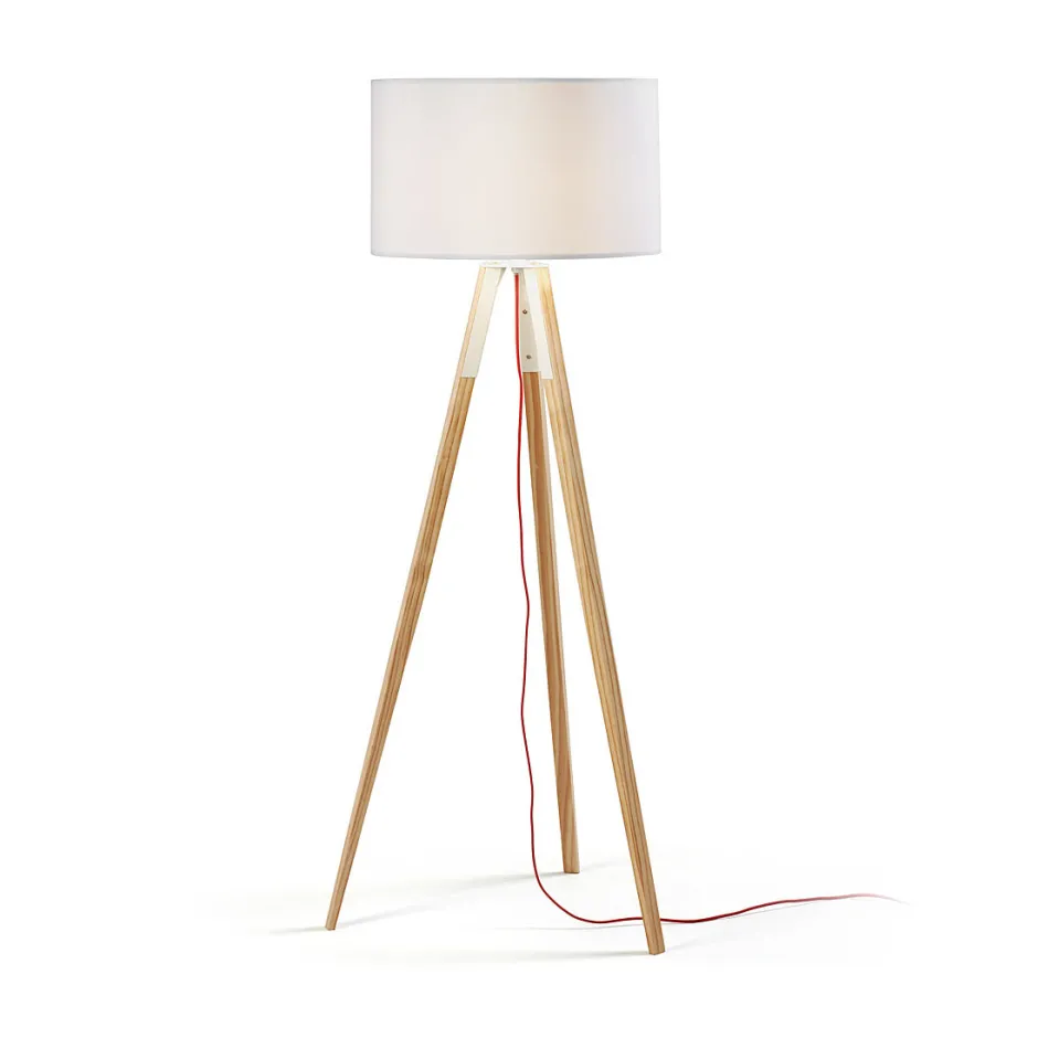 Metalen staande lampen met tripod poten van hout in natuurlijke afwerking. Kap van witte stof. Voor E27-lamp (niet inbegrepen).