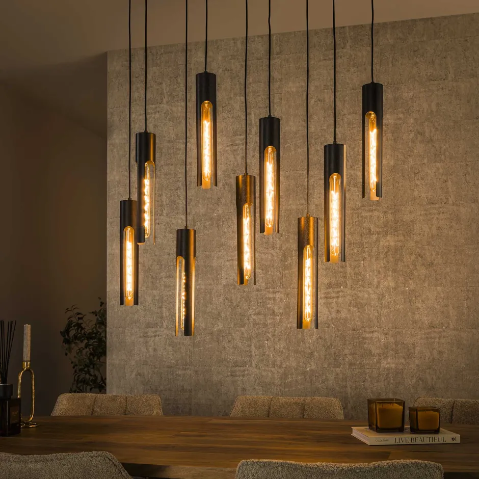 De Charnelle hanglamp is een stoere toevoeging aan je interieur. Met zijn arctic black afwerking en negen elegante lichtbuizen verspreidt deze lamp het licht op een subtiele en sfeervolle manier. De buizen zijn zo ontworpen dat ze een zacht en diffuus lichteffect creëren, perfect voor een gezellige sfeer. Dankzij de verstelbaarheid in hoogte van maximaal 150 cm kun je de lamp geheel naar eigen wens aanpassen. Een unieke lamp die niet alleen functioneel is, maar ook als decoratief element dient in je interieur.