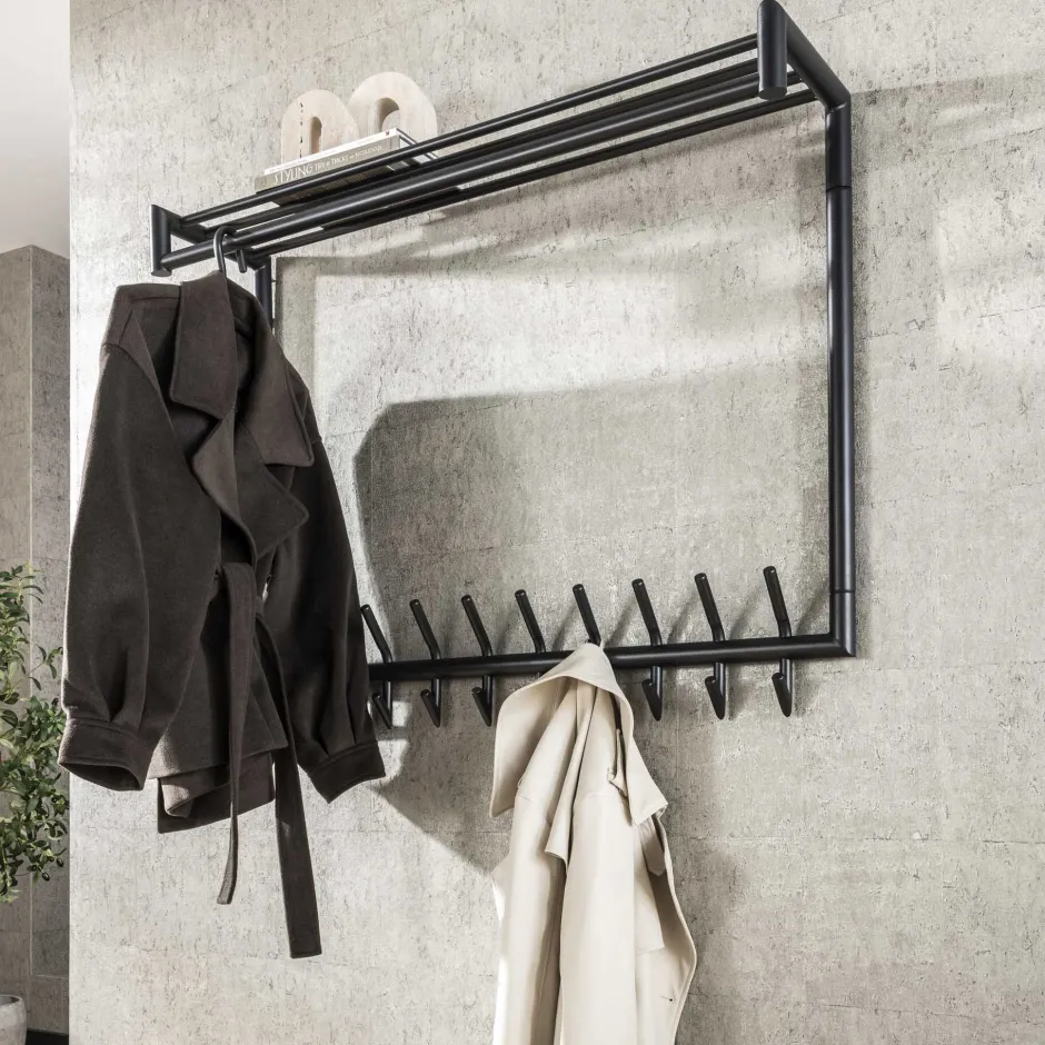Tubo is een industriële wandkapstok van gepoedercoat staal met tien vaste haken, een roede en een hoedenplank. De haken…