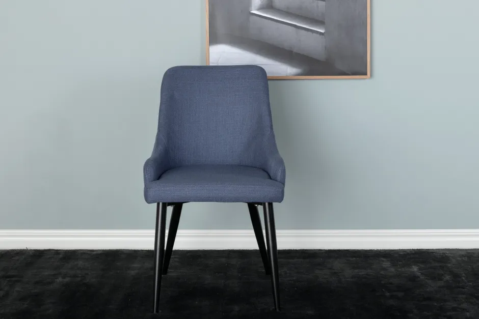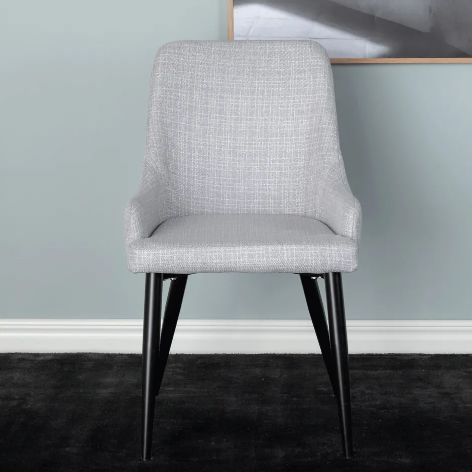 Zit comfortabel in een klassieke eetzon uit de Quennel serie! Deze eetkamerstoel heeft een volledig aangekleed ontwerp met poten van zwart gepoedercoat metaal en rugleuning en zitting van lichtgrijze polyester stof met zachte vulling voor extra hoog comfort. Lichtere montage is vereist. Creëer een aangename sfeer in het hart van het huis!