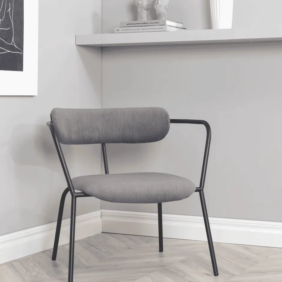 Creëer een modebewuste sfeer met een fauteuil uit de Traver serie! Hij is even stijlvol als praktisch en werkt geweldig als extra zitplaats of alleen als stijlicoon. Traver heeft een minimalistisch ontwerp met frame, poten en geïntegreerde armleuningen van zwart gepoedercoat metaal. De rugleuning is licht afgerond in hetzelfde materiaal als de zitting, grijs corduroy stof gewatteerd voor extra comfort. Richt je huis in met een fauteuil die helemaal volgens de trends is ontworpen! Tips voor fluwelen bekleding: Fluweel heeft de neiging om afdrukken te krijgen als de pool gaat liggen. Door deze afdrukken kan de stof er versleten uitzien, wat heel normaal is voor dit soort materiaal. Afhankelijk van hoe het licht valt, kan de stof in verschillende tinten veranderen.