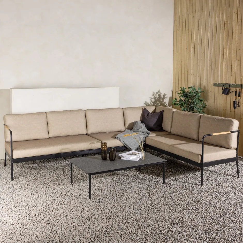 De beige stof geeft de bank een tijdloze en ontspannen esthetiek die harmonieus samengaat met je omgeving. Het zwarte stalen frame geeft de bank en tafel een modern contrast en een gevoel van elegantie.