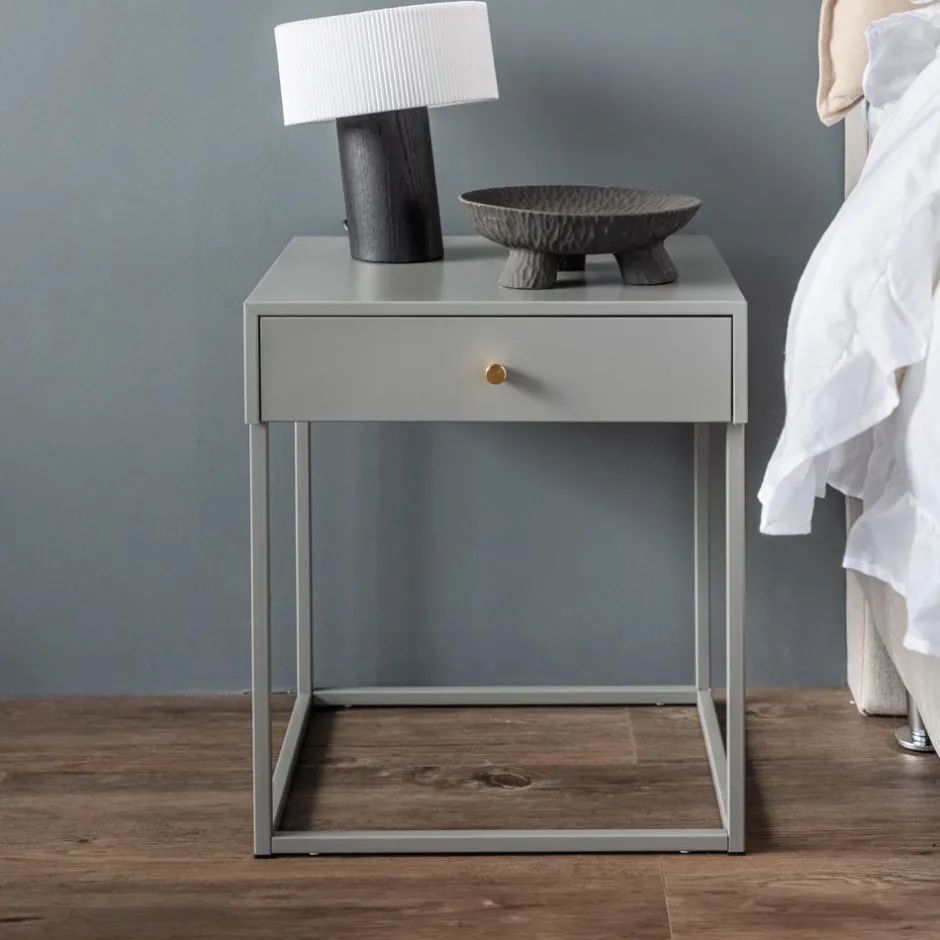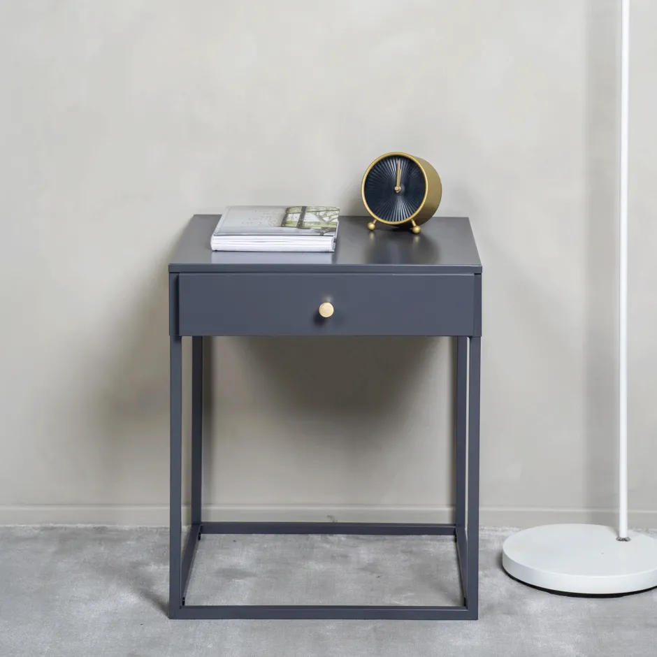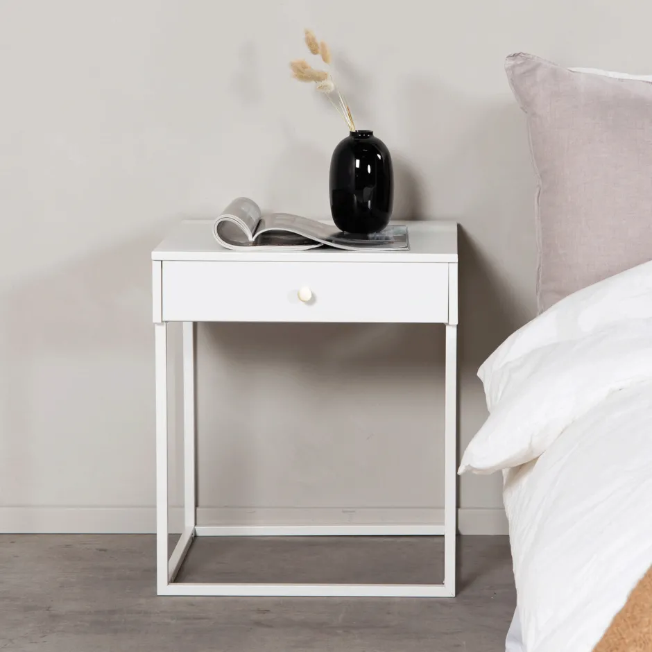 Met een toffe mix van tijdloos design en Scandinavische inspiratie verandert dit stijlvolle beige nachtkastje je slaapkamer in een plek waar stijl en orde samenkomen. Het nachtkastje heeft een handige lade voor verborgen opbergruimte, versierd met een mooie messingkleurige knop die het geheel helemaal afmaakt. Bewaar je avondboek, bril of kleine schatten handig binnen handbereik.