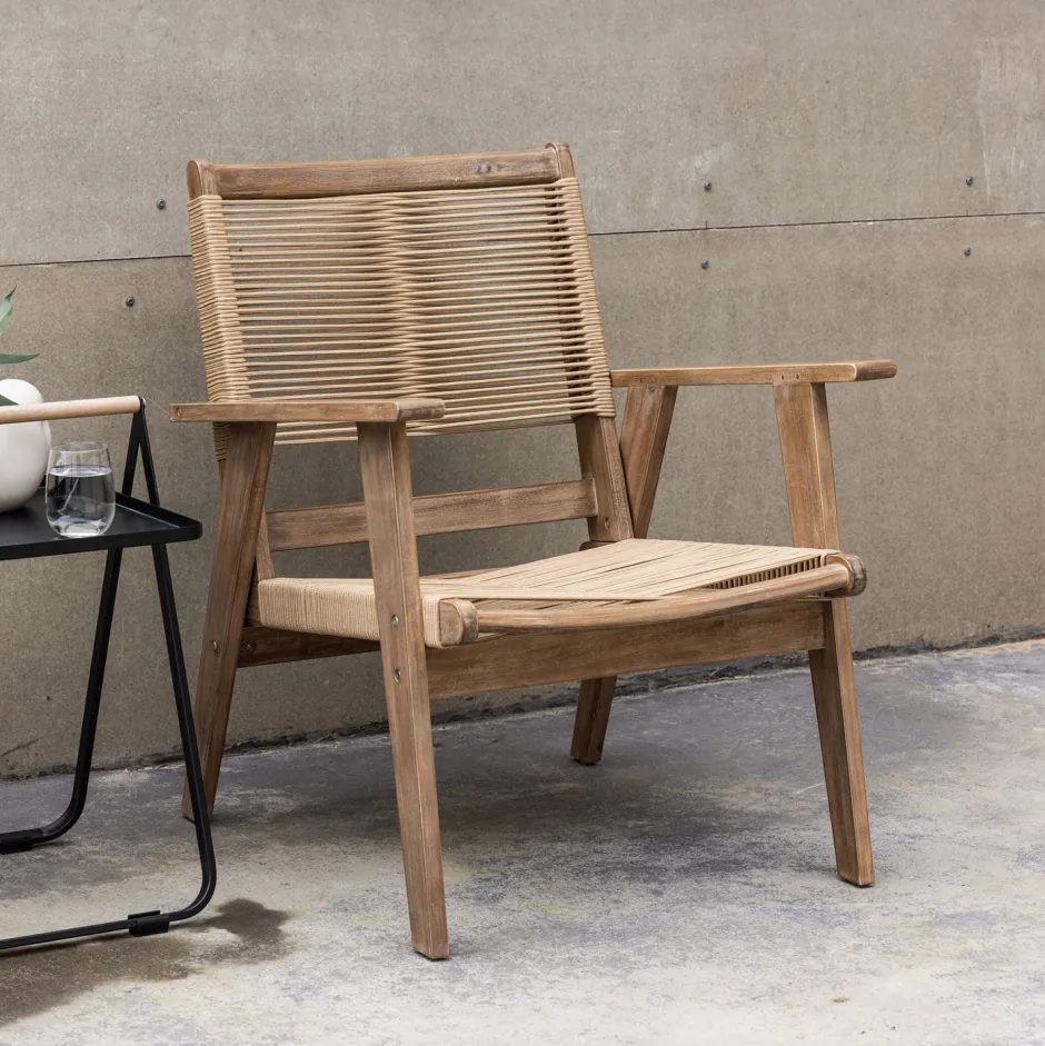 De zitting van Rashidah is zorgvuldig bekleed met dik bruin touw, dat niet alleen zorgt voor een unieke textuur maar ook voor een comfortabele en uitnodigende plek om te gaan zitten. Of je nu droomt van een kopje koffie op de pier in de ochtendzon of gewoon wilt ontspannen in de buitenlucht, Rashidah is de perfecte metgezel voor al je ontspanningsbehoeften.
