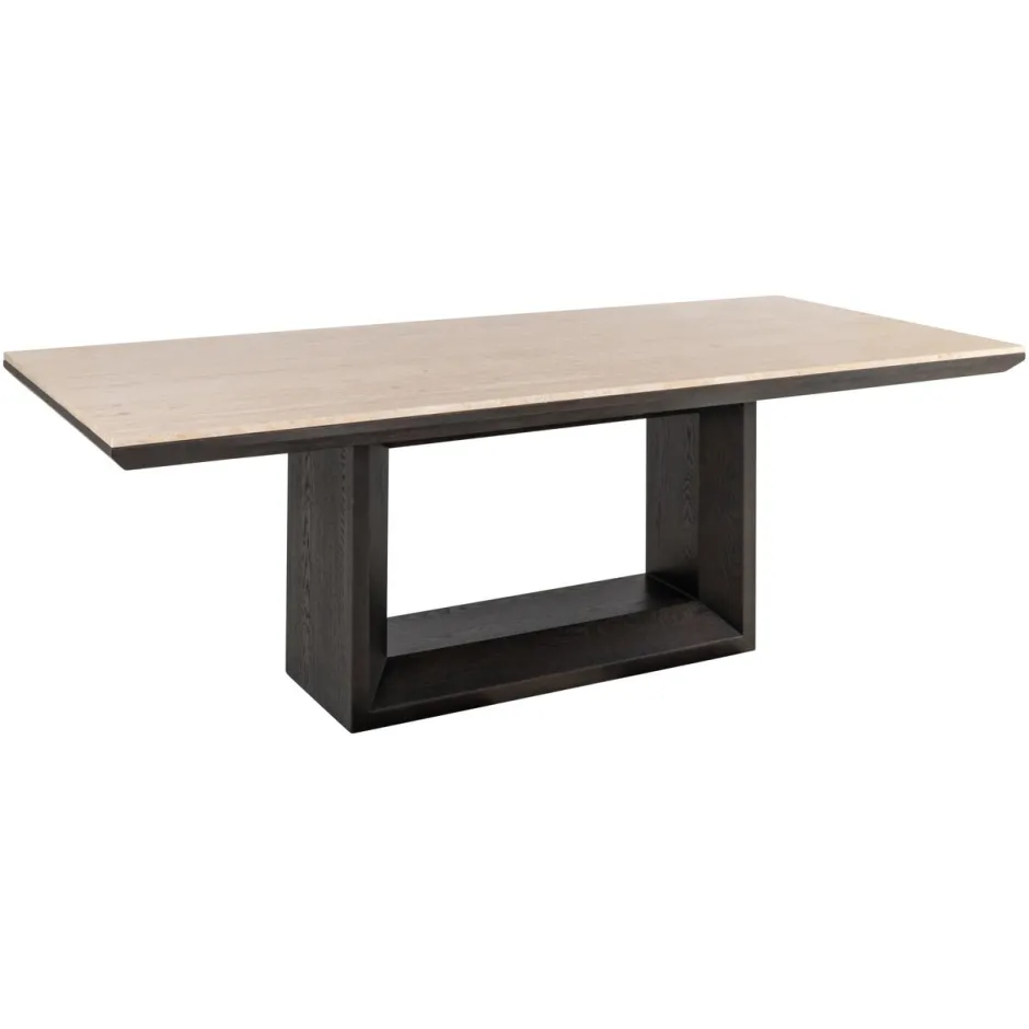 Eettafel Claremont combineert een gedurfde, donkere basis met een luxueus travertin blad. Het sculpturale silhouet maakt hem tot een opvallend middelpunt voor elke eetruimte.