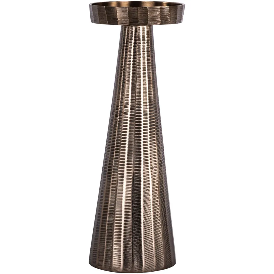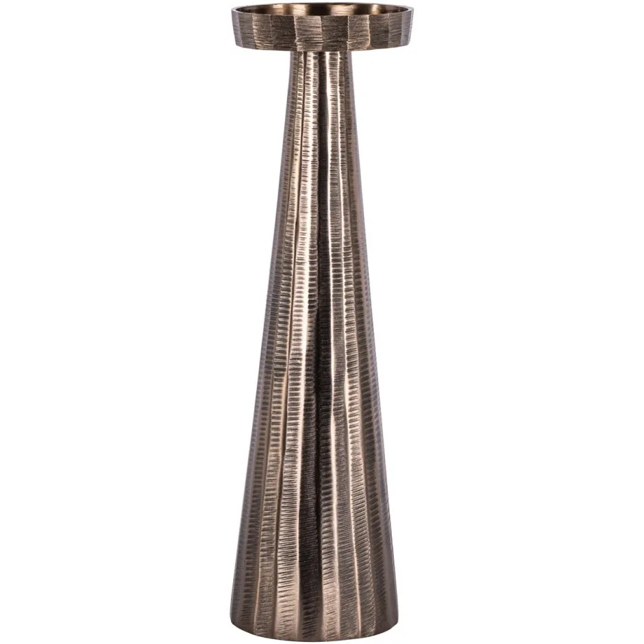 Deze kleine kandelaar heeft een compacte vorm met een duidelijke verticale opbouw. De afwerking toont een bronzen kleur met een zachte glans wat zorgt voor een warme uitstraling. De lijnen zijn eenvoudig en evenwichtig waardoor de kandelaar geschikt is voor plaatsing op een tafel dressoir of open plank. Het ingetogen ontwerp laat zich goed combineren met andere decoratieve objecten.