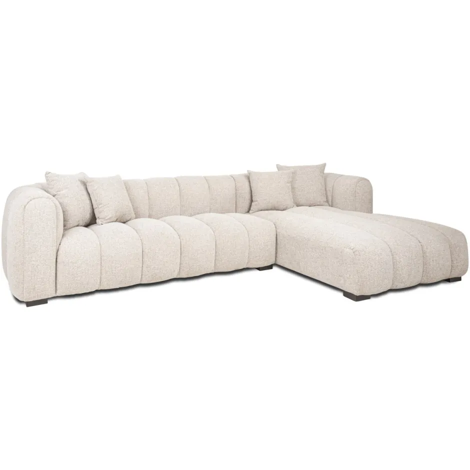 Deze sofa heeft een lage en ruime lounge-opstelling met een duidelijke hoekvorm, gespiegeld ten opzichte van de linkeruitvoering. De zitting en rugleuning ogen breed en comfortabel, met zachte belijning en een rustige uitstraling. De bekleding toont een lichte, natuurlijke kleurindruk met een matte textuur. Door de evenwichtige verhoudingen en het ingetogen ontwerp past de sofa goed binnen moderne en serene woonruimtes.