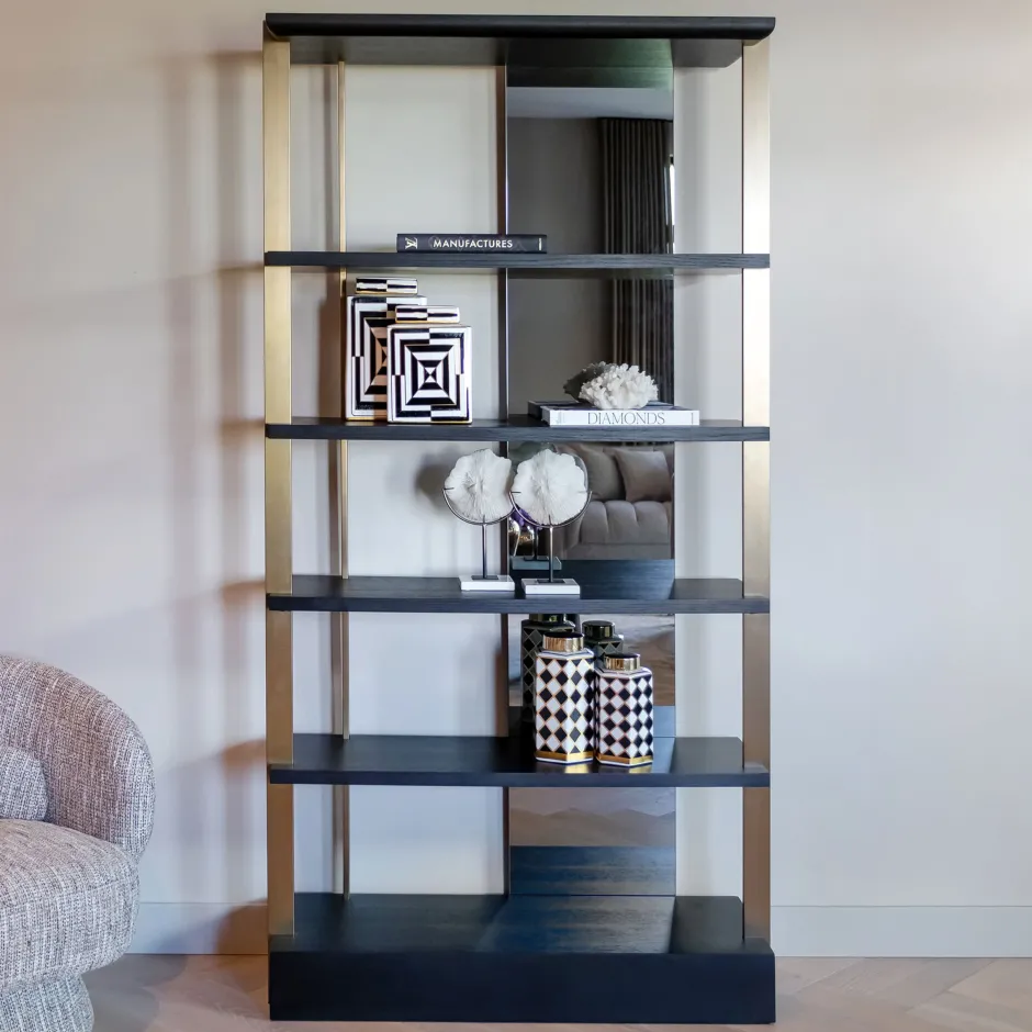 De Wandkast Rigley met spiegel is een strak en stijlvol design dat perfect past in uw luxueuze interior. De wandkast heeft een afwerking van geborsteld goud gecombineerd met eiken fineer in de kleur ‘charcoal’ zwart. Door de spiegelende achterzijde blinkt de wandkast uit en heeft het een uniek karakter. Deze wandkast is 218 centimeter hoog en is daarmee een zogeheten eye-catcher.