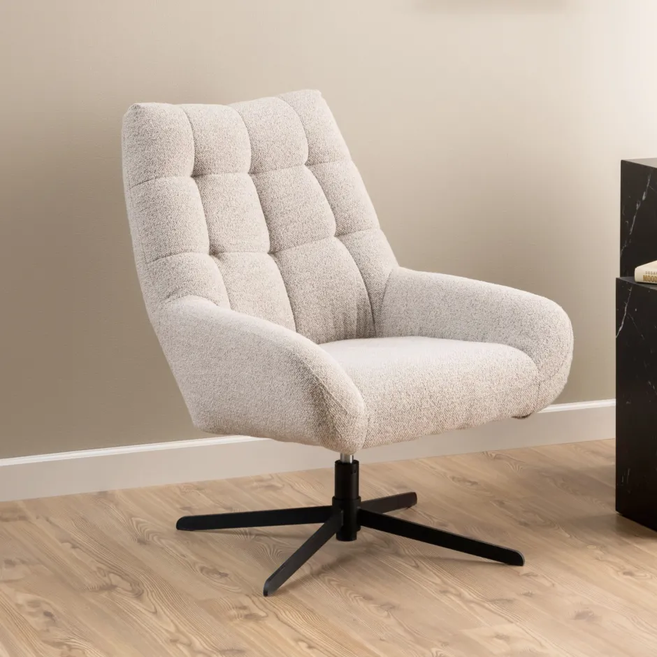 Deze relaxstoel geeft een eigentijdse uitstraling aan elke leefruimte. De beige zitting is gedefinieerd door zachte lijnen en samen met de vierkante stiksels heeft de stoel een moderne maar toch gezellige uitstraling. Bekleed met een krullende bouclé stof, is de stoel comfortabel om in te zitten met armleuningen en zachte ondersteuning. Naast het complementeren van de stoel, maakt de 4-sterren zwarte metalen basis met draaifunctie ook een soepele rotatie mogelijk.