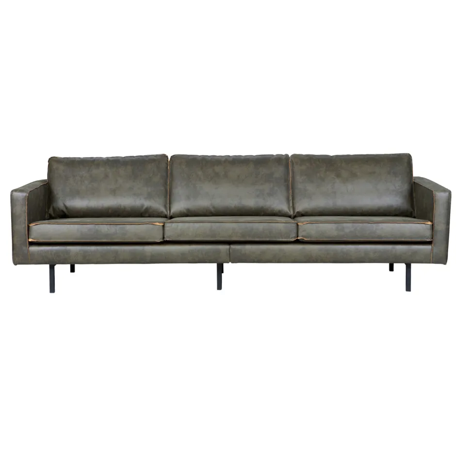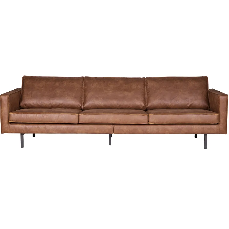 De Rodeo bank is opgebouwd uit een combinatie van massief hout, spaanplaat, polyurethaan schuim met een dichtheid van 25 kg/m3 en een zigzag vering. De zitting bevat een polyurethaan schuim met een dichtheid van 30 kg/m3 (T3037). De rugleuning bestaat uit een combinatie van 70% gesneden schuim en 30% siliconen. Deze Rodeo is bekleed met een lederlook. Onze Copa lederlook heeft een unieke uitstraling en is door het gebruik van leer restanten een duurzame keuze! De lederlook bestaat uit 70% vezels van rundleder, 30% polyester en heeft een Martindale van 30.000. Het materiaal is opgebouwd uit twee onderdelen: de onderlaag bestaat uit gerecyclede leervezels, wat zorgt voor de natuurlijke uitstraling. De bovenste laag is een polyester afdeklaag die het leer beschermt en oneffenheden voorkomt. Hierdoor wordt het een stevige combinatiestof. De microvezel is gebreid van zeer kleine, synthetische vezels. Deze productietechniek zorgt voor de stevigheid en een fijn, zacht gevoel. De stof is zeer kleurvast. Tijdens het gebruik zal het uiterlijk en de structuur van de stof zijn natuurlijke kenmerken meer laten zien, dit verandert niks aan de duurzaamheid en kwaliteit.