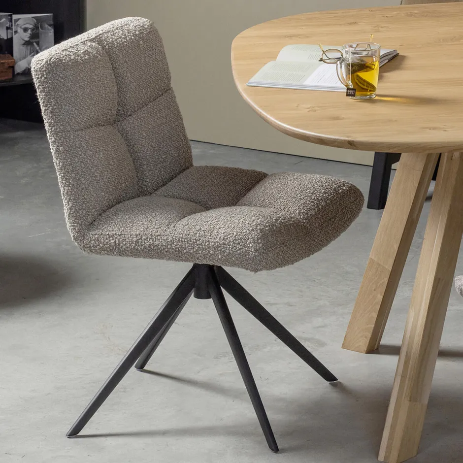 Vinny is bekleed met een superzachte bouclé stof, genaamd Cres. De samenstelling van 100% polyester maak de draaifauteuil zeer eenvoudig in onderhoud. De Vinny heeft een zwart, metalen onderstel met vier poten en een soepel draaisysteem. De polyurethaan schuimvulling geeft een hoog zitcomfort en is dus perfect voor eindeloos lang tafelen!