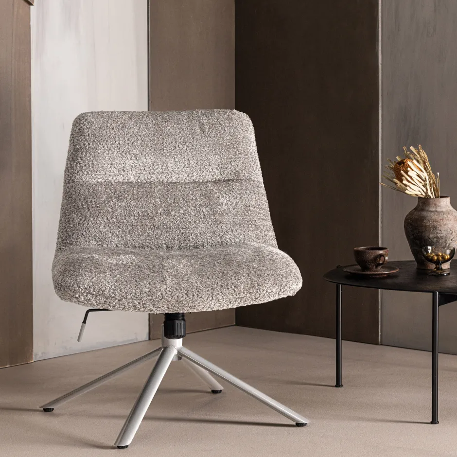 De fauteuil is bekleed met de Bear stof, een luxe wollige bekleding die bestaat uit 100% polyester. Deze stof heeft een Martindale waarde van 30.000, wat betekent dat de stof met het juiste onderhoud jarenlang mooi blijft. De wollige textuur geeft een zachte uitstraling en voelt prettig aan. Het grijze onderstel zorgt voor een stevige basis en draagt bij aan het moderne karakter van deze draaifauteuil.