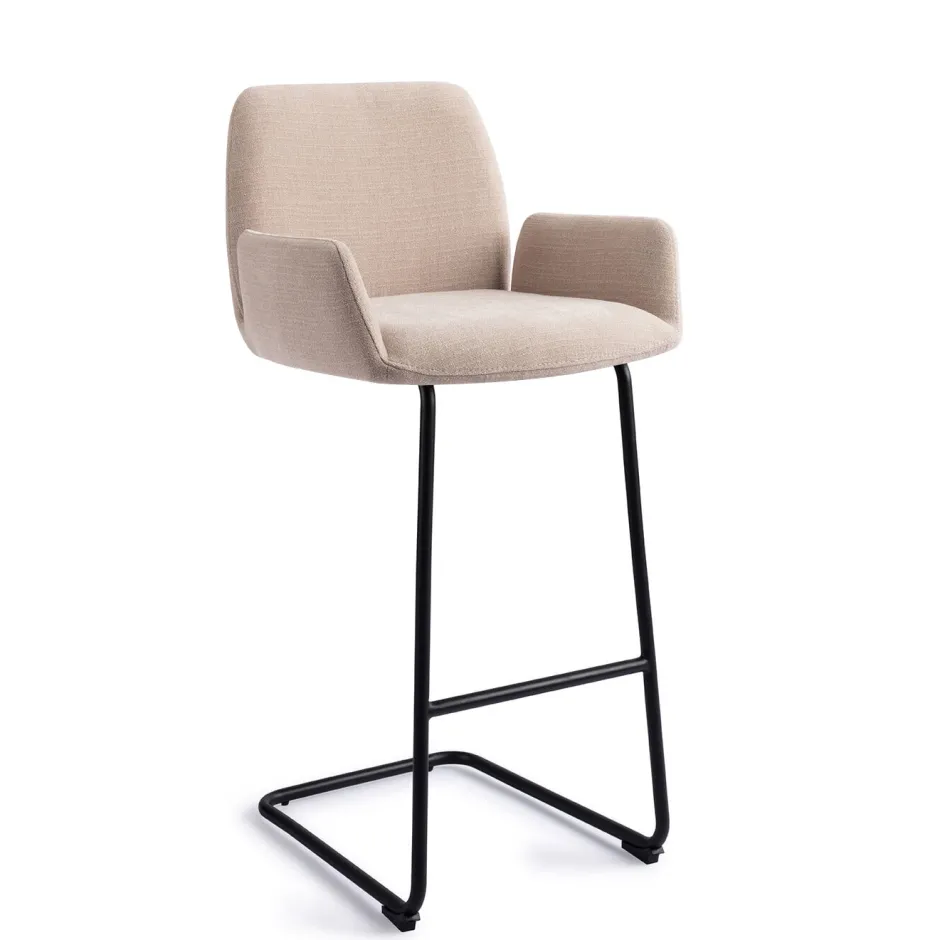 De armleuningen van de Misaki barkruk zijn een beetje los van de rugleuning. Deze eigenschap geeft de stoel bijna het uiterlijk van uitgestrekte vleugels, wat de stoel een licht karakter geeft. Bovendien bieden de armleuningen ondersteuning en comfort. De bekleding is een duurzame 100% polyester stof die er uitziet en voelt extreem zacht en luxe.