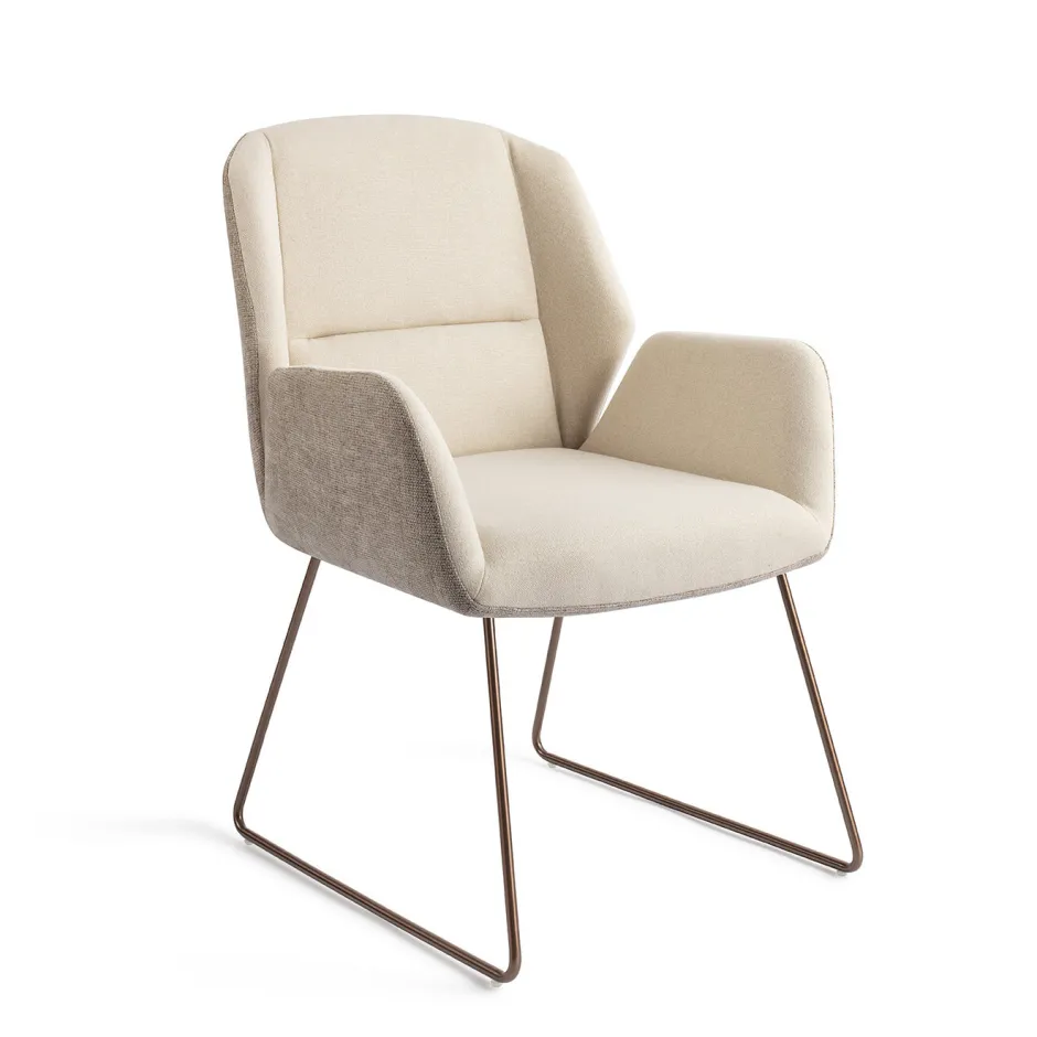 De zitting van de Myoko heeft een mooi verdeelde schuimlaag die niet te hard en niet te zacht is. Stevige armleuningen en de rechte rugleuning zorgen voor een juiste zithouding met voldoende steun. De zitting is bekleed met twee verschillende stoffen in verschillende kleuren wat zorgt voor een speels contrast en tegelijkertijd eenheid door de neutrale kleuren.