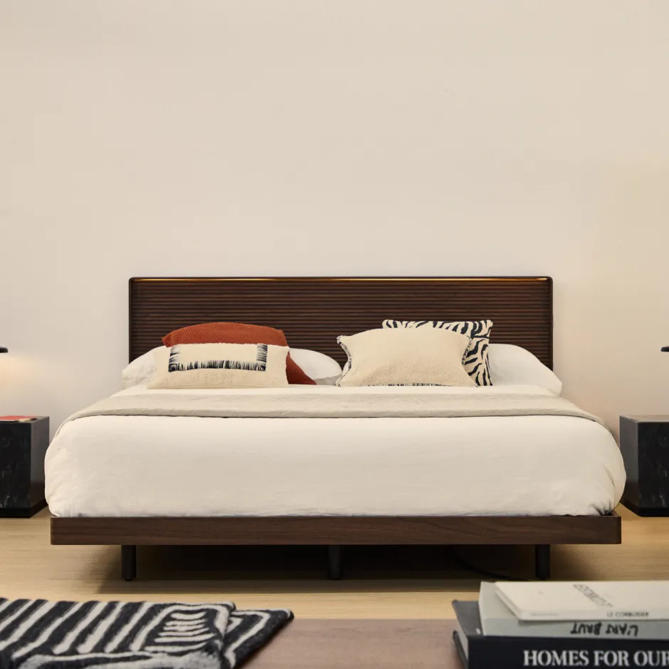 - Bed met hoofdbord in walnootfineer met horizontale lineaire frees en LED-lichtstrip aan de bovenkant.