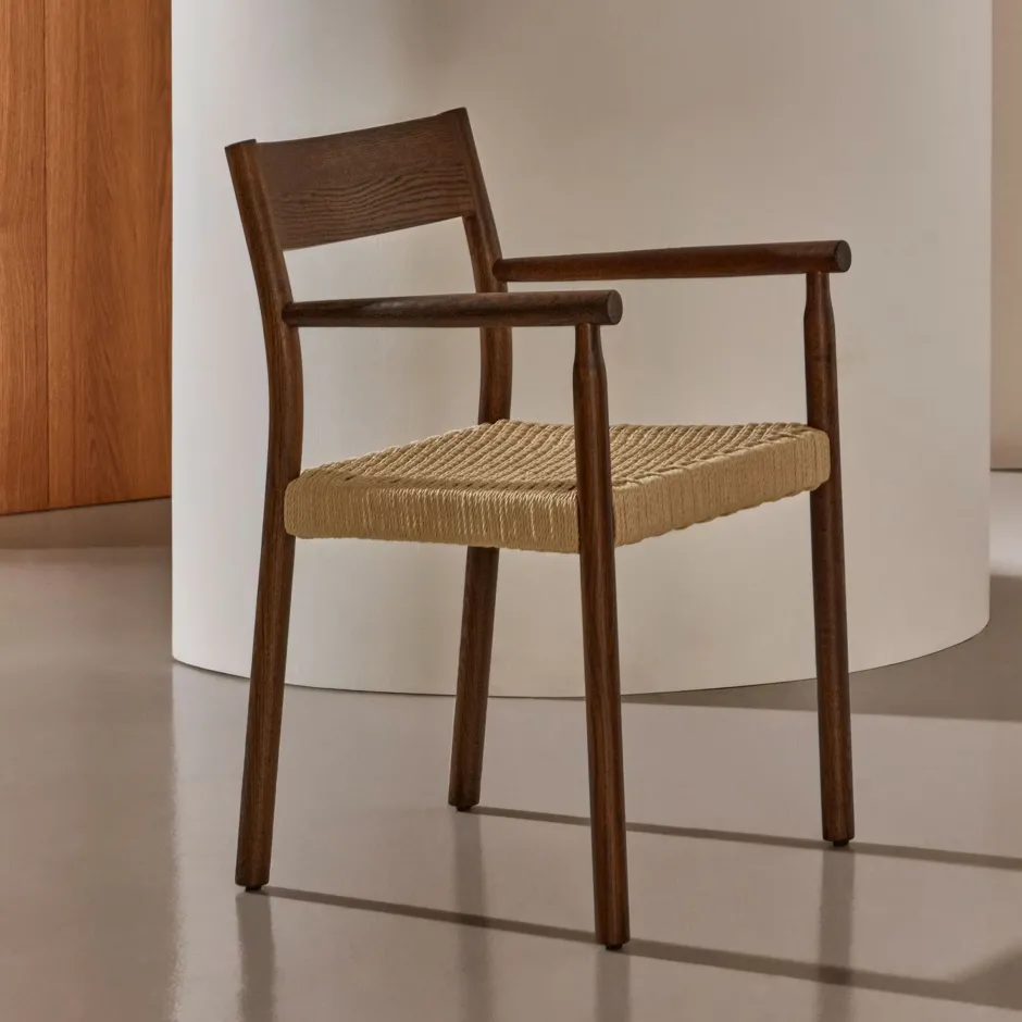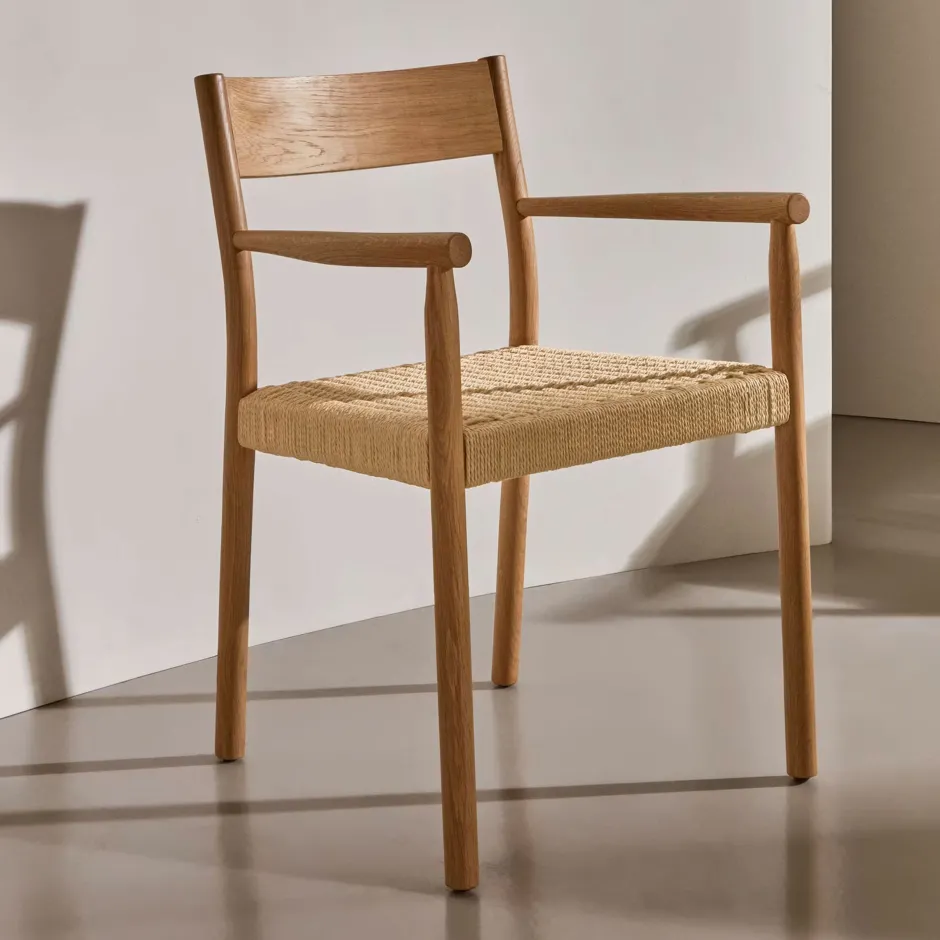 De Yalia-stoel is een handgemaakt ontwerp met een frame van massief eikenhout en een zitting van handgevlochten papiertouw. Hij heeft ook de ideale afwerkingen om de natuur in huis te halen.