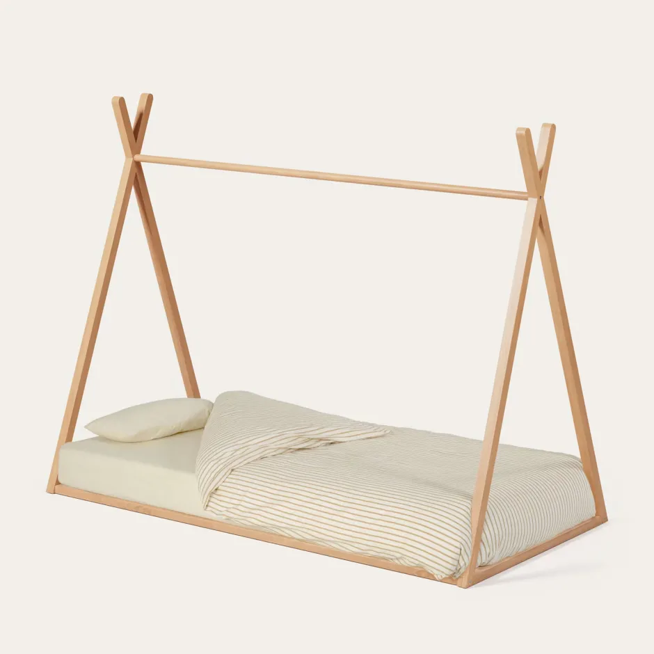 De beste manier om de fantasie van je kleintje de vrije loop te laten, is met dit massief essenhouten tipi-bed. Het bed heeft de vorm van een tipi en is laag, zodat het veilig is en de zelfstandigheid en bewegingsvrijheid van je kleintje stimuleert.