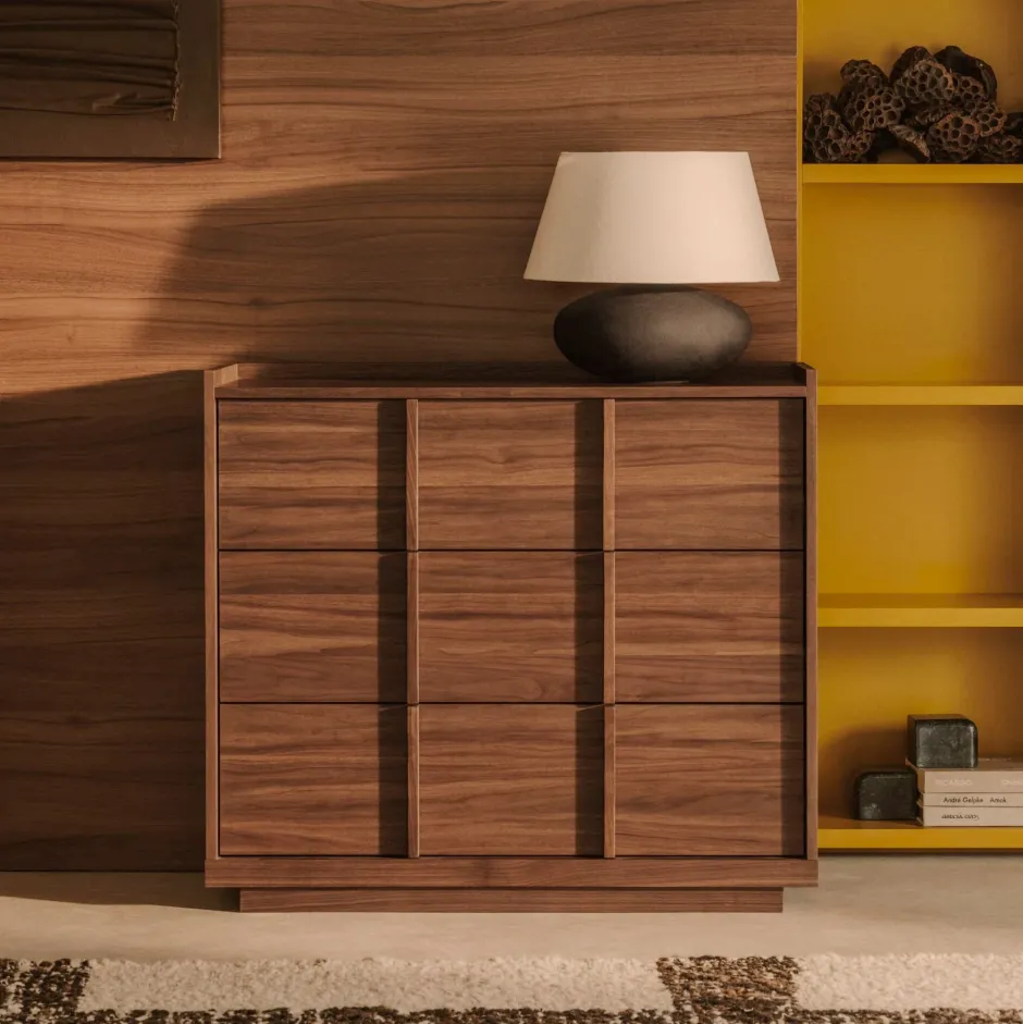 Ladekast ‘Onix’ van Kave Home is een stijlvolle knipoog naar Japanse eenvoud. Gemaakt van notenfineer in een donkere afwerking, straalt dit meubel warmte en verfijning uit. De verticale latjes in het design doen denken aan traditionele Japanse Shoji-deuren, met hun kenmerkende houten rasterwerk. Achter de soft closing lades vind je genoeg opbergruimte, perfect om je spullen netjes op te bergen.