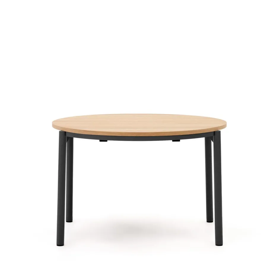 - Ronde uitschuifbare tafel van eikenfineer en stalen grijze poten.