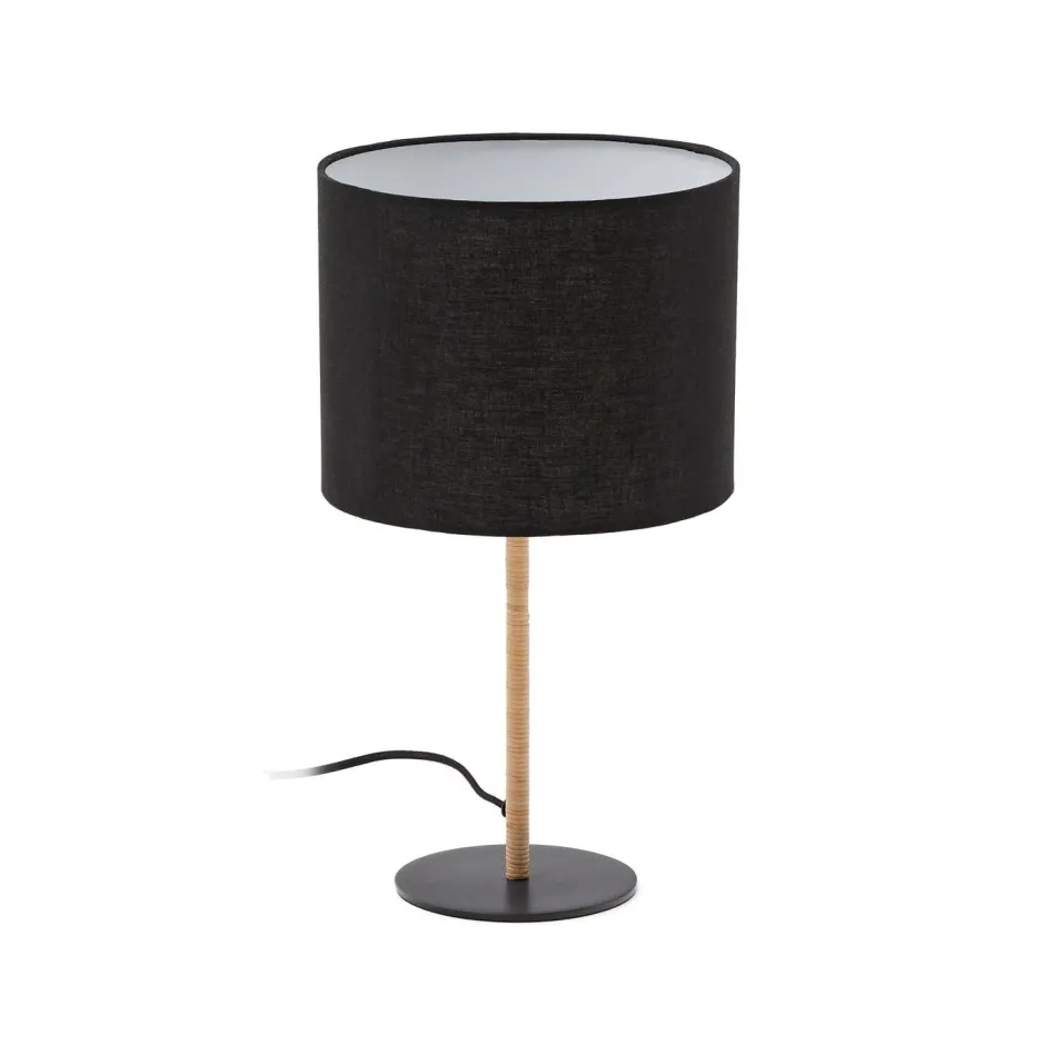 - Metalen tafellamp met detail van natuurlijk rotan en een zwarte katoenen lampenkap.