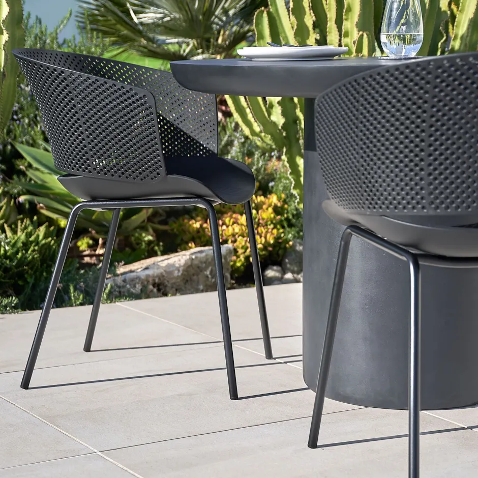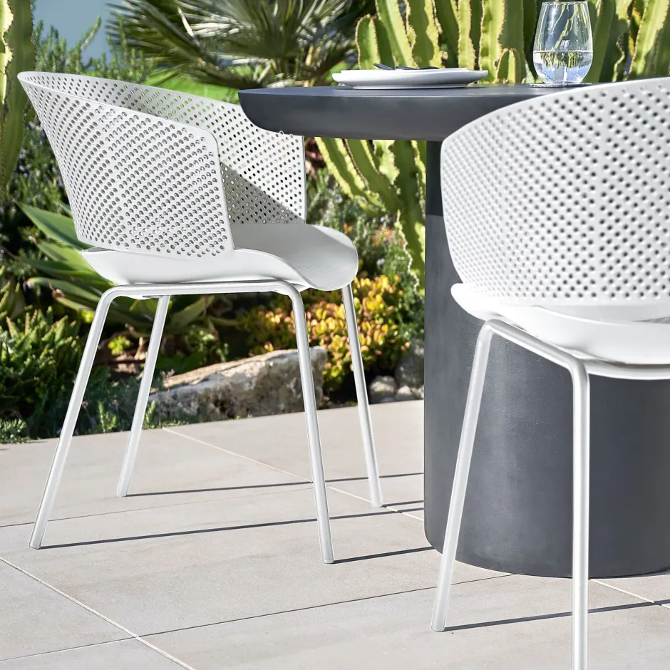 Onze Yeray stoelen combineren stijl en veelzijdigheid. Ze zijn gemaakt van recyclebaar plastic met een UV-bestendige behandeling en stalen poten die geschikt zijn voor gebruik buitenshuis. Ontworpen om je balkon, terras, tuin of eetkamer onmiddellijk op te waarderen. Binnen of buiten? De keuze is aan jou.