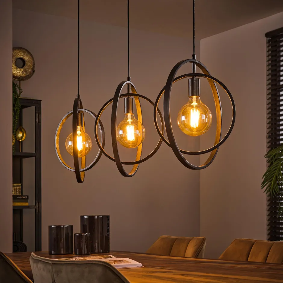 Deze hanglamp is gemaakt van metaal met een Charcoal finish. De buitenste cirkels zitten vast aan de stroomkabels en de binnenste cirkels kunnen volledig rond draaien, waardoor deze op de gewenste manier geplaatst kunnen worden. Door het opengewerkte armatuur komen de lichtbronnen volledig tot hun recht en wordt de ruimte mooi verlicht. Deze hanglamp is tot 150 cm in hoogte verstelbaar en is ideaal voor boven een eetkamertafel!