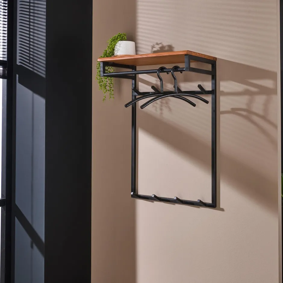 Deze kapstok ‘Kelsie’ is voorzien van een hoedenplank gemaakt van massief acacia hout. Zorgvuldig geselecteerd hout, voorzien van een fijne nerf en diverse noesten, die op ambachtelijke wijze wordt verwerkt. Dit zorgt voor een natuurlijke én unieke look aan de wand. Aan de hoedenplank is een zwart geschuurd metalen roede bevestigd en zijn er 2×4 haakjes aanwezig. Er kunnen dus zowel jassen aan een haakje als aan een hanger worden opgehangen. De kapstok is voorzien van twee bevestigingsogen aan de achterzijde, zodat de kapstok eenvoudig aan de wand kan worden gemonteerd.