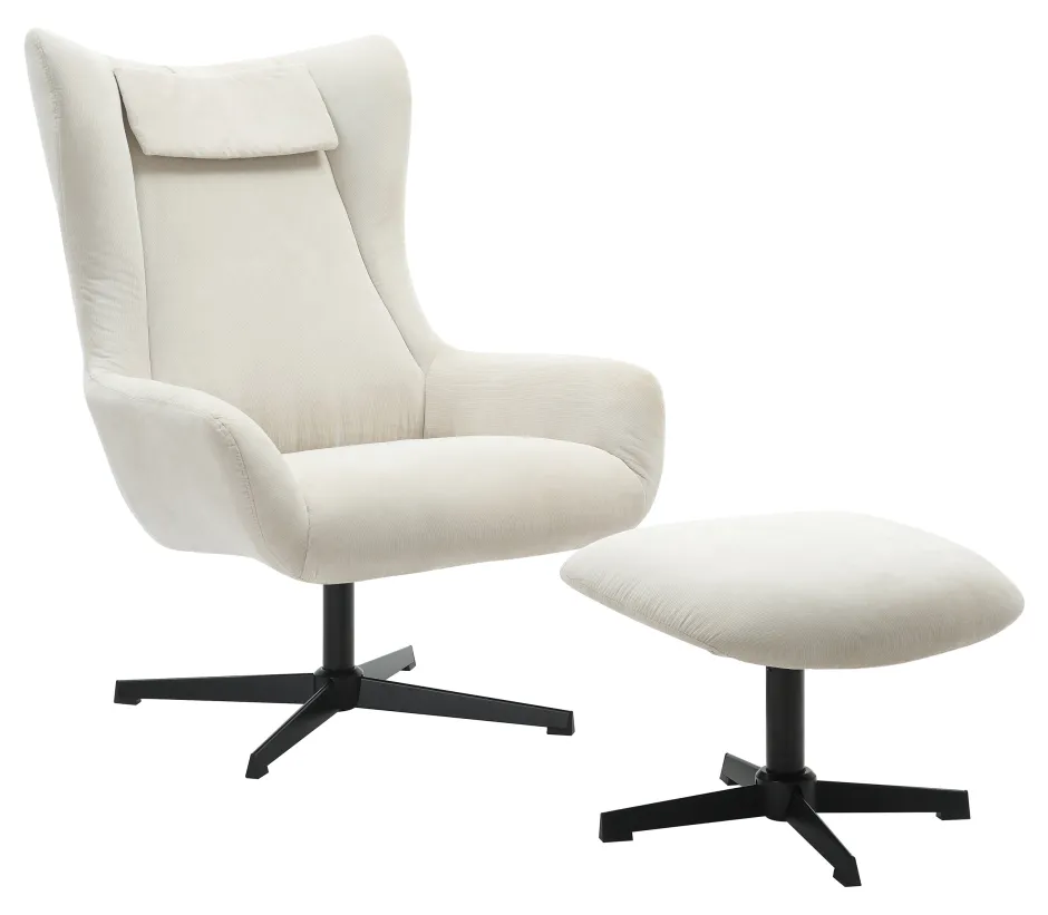 Deze fauteuil en poef set combineert modern design met eersteklas comfort en duurzame materialen. De corduroy stof van de set is niet alleen visueel aantrekkelijk met zijn fijne strepen en subtiele glans, maar ook milieuvriendelijk: het is Oeko-Tex gecertificeerd en PFC-vrij, wat betekent dat het vrij is van schadelijke chemicaliën en op een milieuvriendelijke manier is vervaardigd. De bekleding van polyetherschuim en pocketveren biedt eersteklas zitcomfort en optimale ondersteuning. Of je nu achterover leunt in de fauteuil of je voeten laat rusten op de poef, je zult genieten van het comfort van deze set. De draaifunctie van de fauteuil en hocker maakt flexibel gebruik mogelijk en verhoogt het comfort nog meer. De zwarte poten met poedercoating geven de set een moderne en elegante touch die perfect past bij verschillende interieurstijlen. De gestoffeerde set is de ideale keuze voor iedereen die waarde hecht aan design en functionaliteit en een speciaal tintje aan zijn huis wil geven.