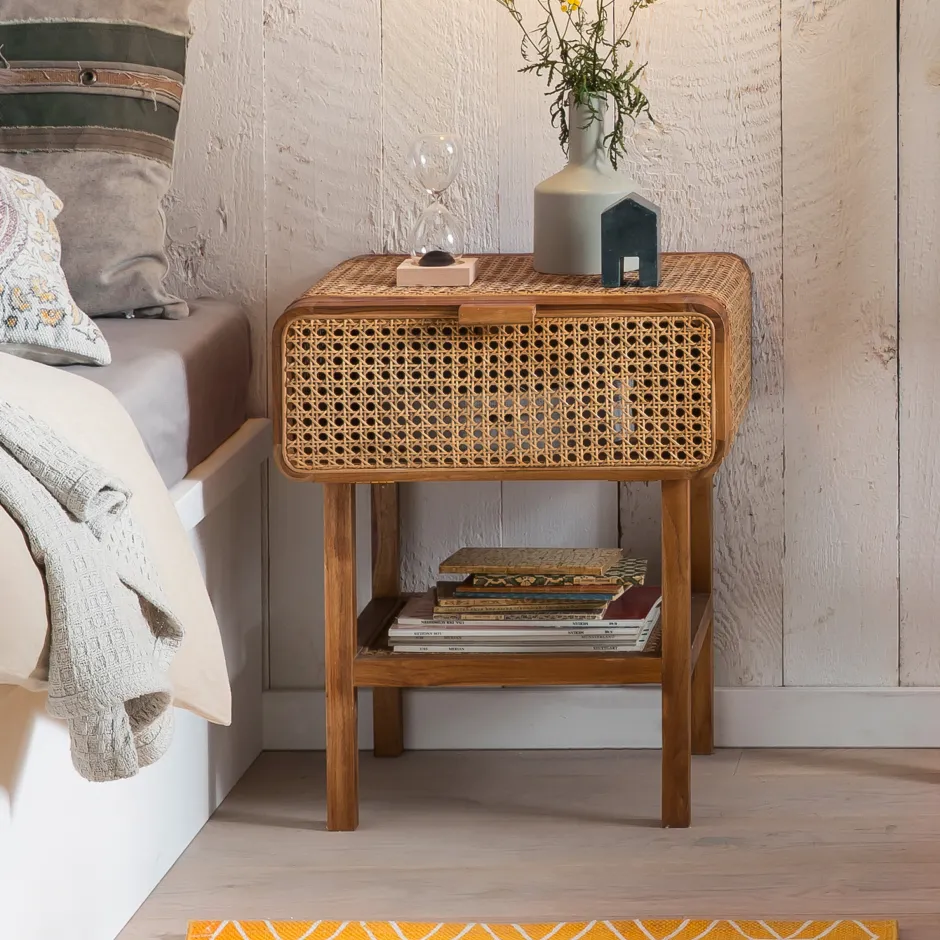 Gerecycled teakhout van schuren en gesloopte huizen is vriendelijk voor het milieu en geeft dit nachtkastje, in combinatie met rotan vlechtwerk in het Weense patroon, de antieke koloniale uitstraling die typisch is voor Indonesië. Achter het uitklapbare vak van het handgemaakte nachtkastje is ruimte voor boeken en privéspullen. Voldoende oppervlak voor het bedlampje, de wekker, boeken, leesbrillen etc. wordt geboden door de planken die ook in prachtig Weens vlechtwerk zijn uitgevoerd. Het nachtkastje kan ook worden gebruikt als een op zichzelf staand stuk in andere woonruimtes, bijvoorbeeld als gangkast of kleine ladekast, waar het echt tot zijn recht komt met zijn charme. De ladekast kan worden gecombineerd met moderne meubels in slaapkamers. De kast zou ook even effectief zijn in kleine eenpersoonshuishoudens als nisvulling.