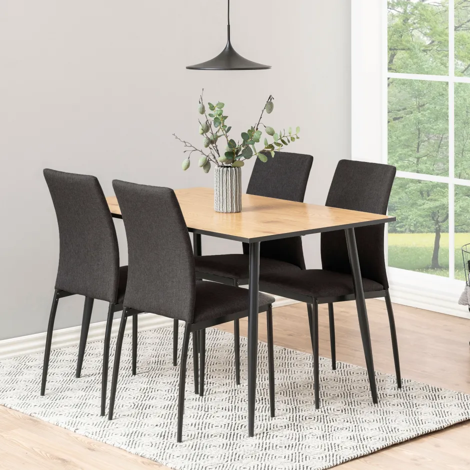 Gemaakt van metaal en melamine is deze eettafel zowel visueel aantrekkelijk als duurzaam. Het heeft slanke, schuine poten en een tijdloos ontwerp. De keuze van materialen zorgt voor minimaal onderhoud van het meubilair dat gemakkelijk schoon te vegen is.