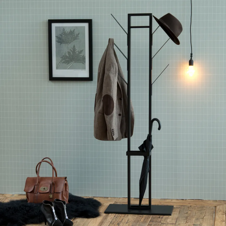 Een minimalistisch hulpje, dat altijd klaar staat om je een handje te helpen. Nou ja, zijn knijpers om precies te zijn. Hij kan meerdere jassen, jacks en andere accessoires dragen en er toch stijlvol uitzien. Oh en let op de praktische paraplubak. Hij is gemaakt van duurzaam metaal dat de kapstok een licht industrieel gevoel geeft. De vlakke voet zorgt ervoor dat het gewicht gelijkmatig wordt verdeeld, wat de stevigheid ten goede komt.
