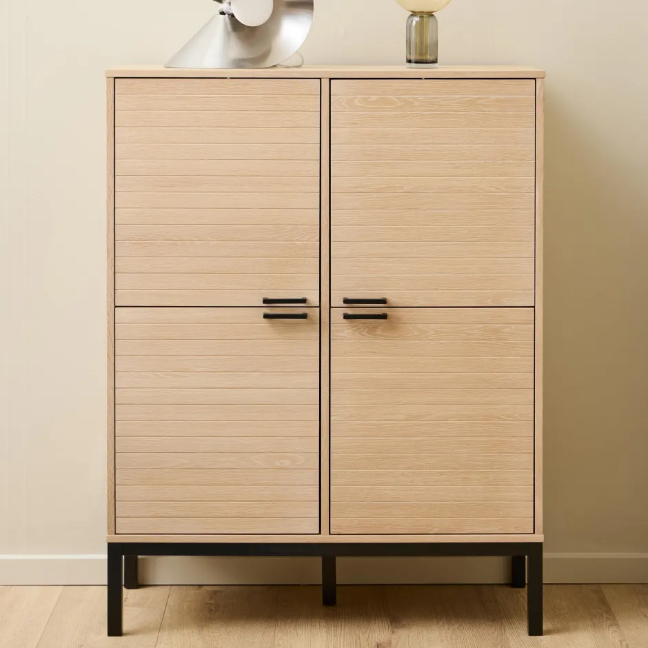 Deze opvallende kast nodigt uit tot een verfrissende energie in het interieur. Door zijn contrasterende uiterlijk, verkregen door het mengen van wit gepigmenteerd geolied eikenfineer en zwart gelakt eikenfineer, versterkt de kast de dynamiek in de kamer. Hij is ontworpen met 6 verstelbare planken die verborgen zitten achter 4 deuren die versierd zijn met decoratieve lamellen.