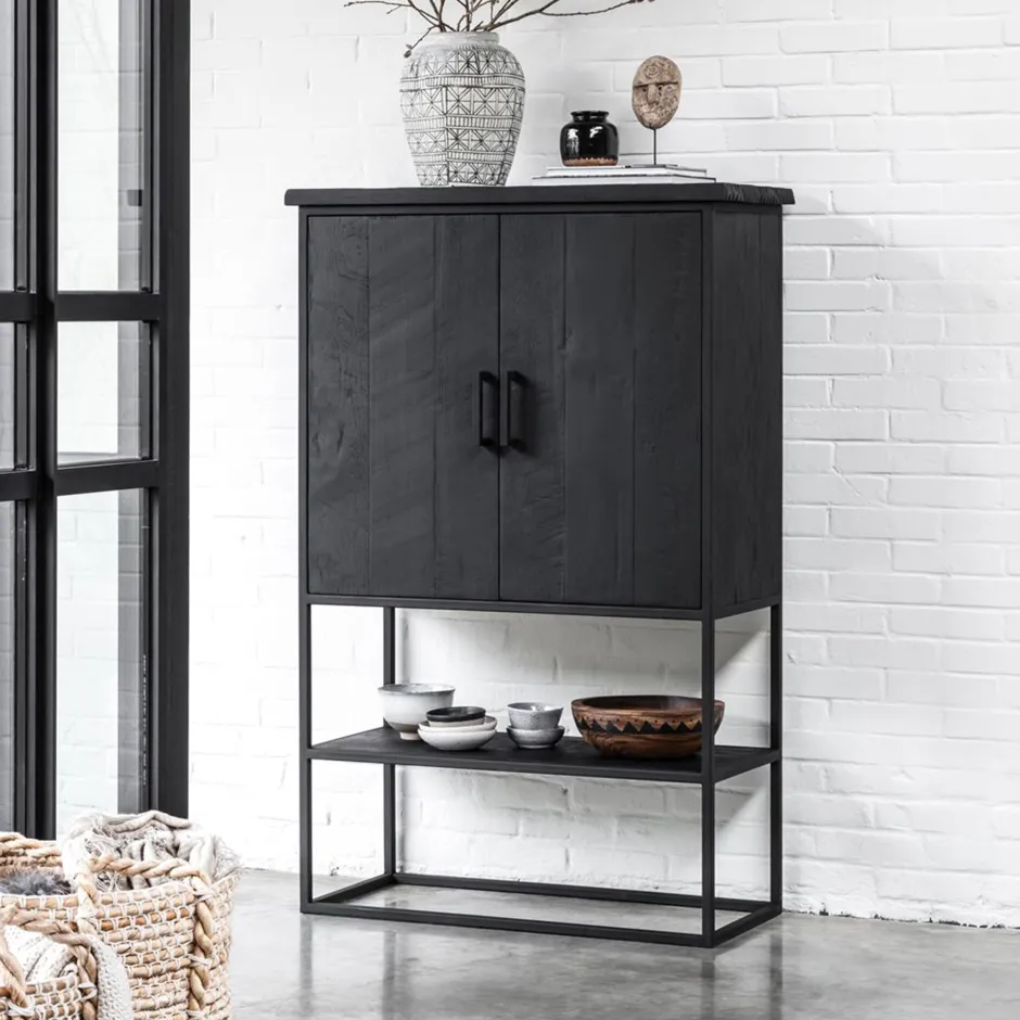 Opbergkast Beam is een meubel uit de collectie van DTP Home Timeless Black. De kast is gemaakt van gerecycled teakhout en voorzien van een zwarte beits met een transparante lak. De afmeting van de bergkast is 140x90x40 cm en bestaat uit 2 deuren en 1 open vak.