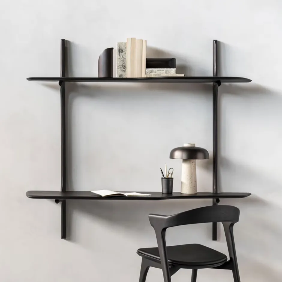 Het bureau is voorzien van een handige plank boven het blad, perfect om kleine spullen of decoratie op kwijt te kunnen. Doordat het bureau aan de muur hangt, oogt het licht en ruimtelijk. PI past prachtig in een modern, warm Japandi interieur en is ideaal voor een stijlvolle werkhoek in huis.