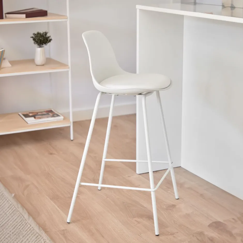 Je zult met kruk Brighter van 65 cm hoog altijd lekker zitten dankzij de zitting met rugleuning. De stoffering van wit synthetisch leer zorgt voor meer licht in de keuken. Voor diegene die nog extra lekker willen zitten heeft het ook een voetensteun gemaakt van mat wit geverfd staal. En maak je je geen zorgen om de vloer, de poten hebben een plastic bescherming om krassen te voorkomen. All advantages!