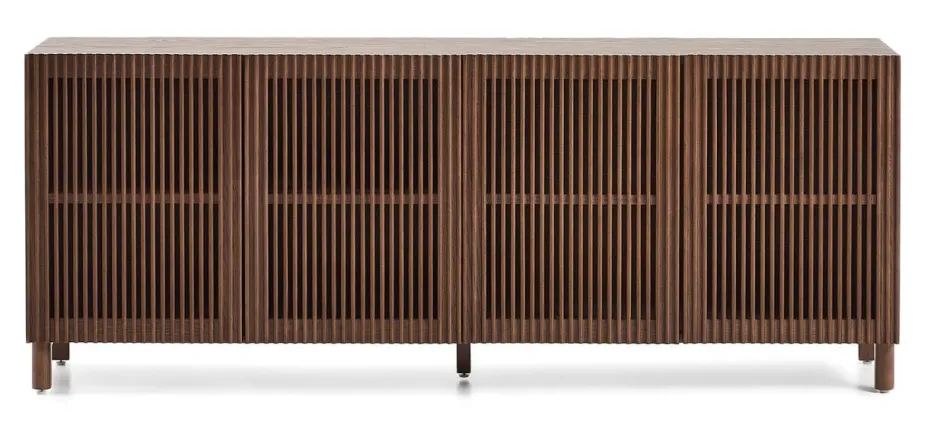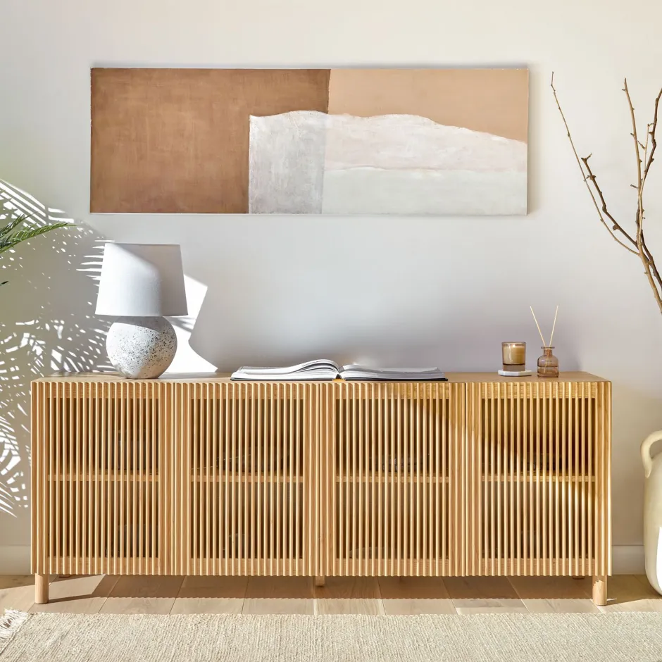 Het dressoir uit de Beyla-collectie combineert de natuurlijke essentie van eikenhout met een ontwerp dat tot in het kleinste detail is uitgewerkt. De structuur is gemaakt van eikenfineer, terwijl de deur en poten van massief essenhout zijn. De openslaande deuren hebben verticale latten die zorgen voor visueel ritme en het licht subtiele contrasten op het oppervlak laten creëren. Binnenin kun je met de verstelbare planken de opbergruimte aanpassen aan je behoeften, zodat functionaliteit wordt geboden zonder concessies te doen aan het design. De poten zijn voorzien van stelschroeven om eventuele oneffenheden in de vloer te corrigeren en stabiliteit te garanderen. Al het gebruikte hout is FSC™ 100%-gecertificeerd, wat de toewijding aan verantwoord bosbeheer weerspiegelt. Een meubelstuk dat is ontworpen om de woonkamer aan te kleden met stijl, orde en warmte.