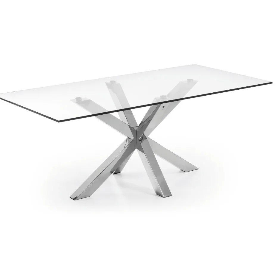 Tafel met blinkend roestvrijstalen onderstel en blad van gehard glas.