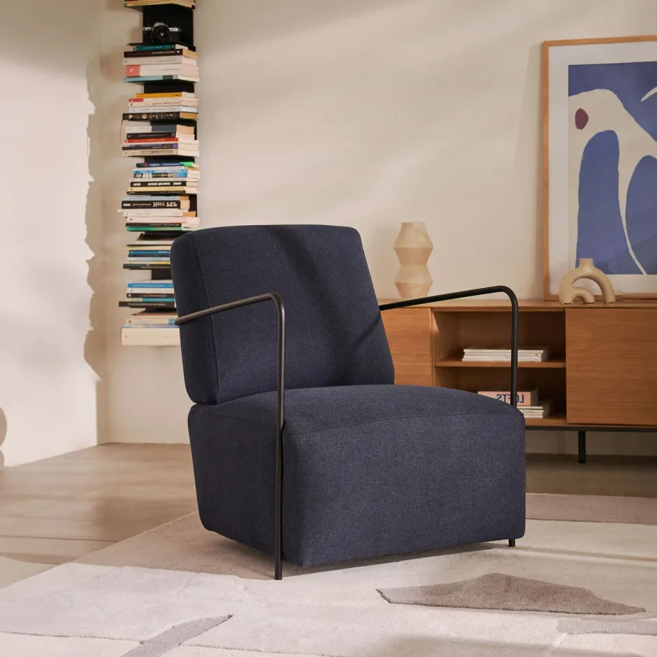 De Gamer fauteuil, met een slanke stalen structuur en bekleed met stof met een kleine blauwe structuur, is ontworpen door Kave Home, geïnspireerd door de trend om de gehele structuur in één oogopslag te tonen. Geen gimmicks. Je voelt je niet alleen comfortabel, je kunt het nu ook zien.