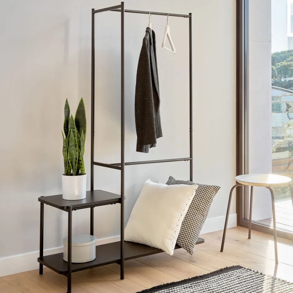 Het Galatia kledingrek van Kave Home is een strak en minimalistisch meubelstuk voor iedere slaapkamer of hal. Het rek heeft een stevig gepoedercoat metalen frame in zwart, dat een moderne en stoere uitstraling geeft. Twee melamine planken bieden extra ruimte om schoenen, tassen of accessoires overzichtelijk neer te zetten.