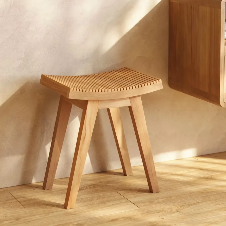 Het krukje Vicentina van Kave Home is gemaakt van teakhout en straalt een verfijnde Aziatische stijl uit. De zitting met houten latjes geeft het krukje een luchtige en ambachtelijke uitstraling. Dankzij de natuurlijke vochtbestendigheid van teakhout is dit krukje niet alleen geschikt voor de woon- of slaapkamer, maar ook perfect voor in je badkamer.