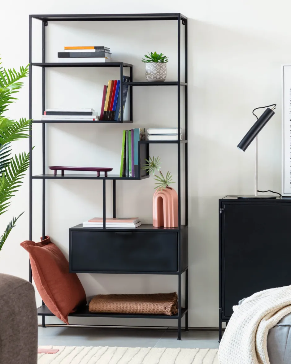 - Meubel volledig gemaakt van metaal, geschilderd met een matte zwarte afwerking.