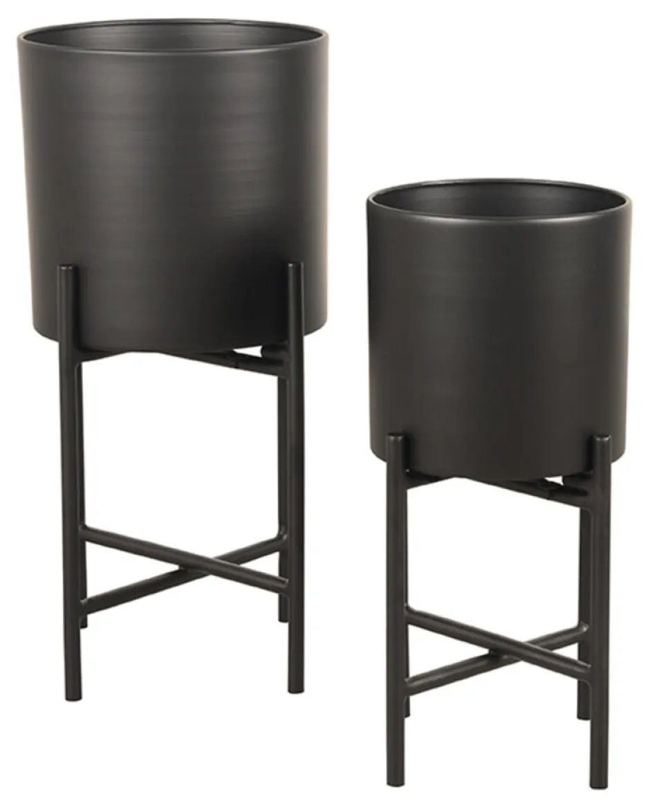 * Set Plantenstandaard met zwart metaal onderstel met kruispoot en losse bloempot