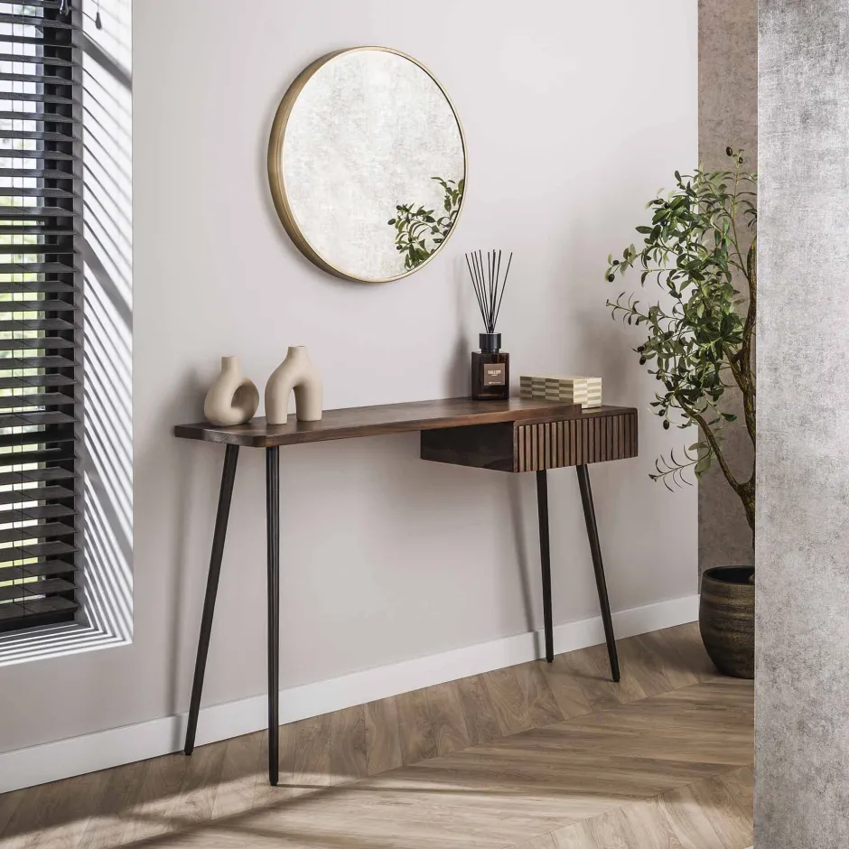Het metalen onderstel in een bronzen tint geeft de tafel een elegant en stoer accent en vormt een mooi contrast met het hout. Dankzij het veelzijdige ontwerp kun je deze tafel op verschillende plekken gebruiken: als sidetable in de hal, als kaptafel in de slaapkamer of als subtiele plek voor accessoires in de woonkamer. De praktische lade biedt daarnaast ruimte voor kleine spullen die je graag netjes uit het zicht opbergt.