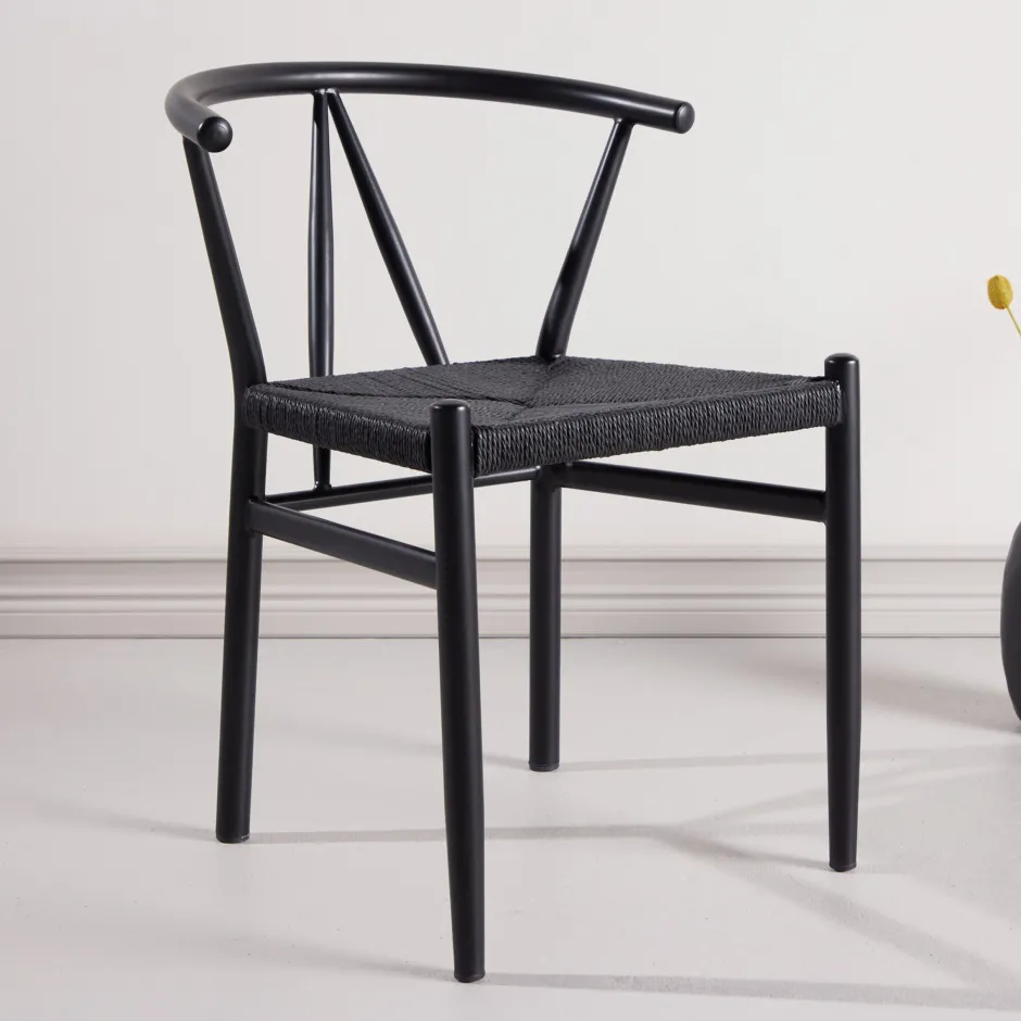 Atalie eetkamerstoel combineert stijl en functionaliteit op een elegante manier. Met een zitting van beige rotan en een frame van zwart staal geeft hij een tijdloze en klassieke uitstraling aan je eettafel.