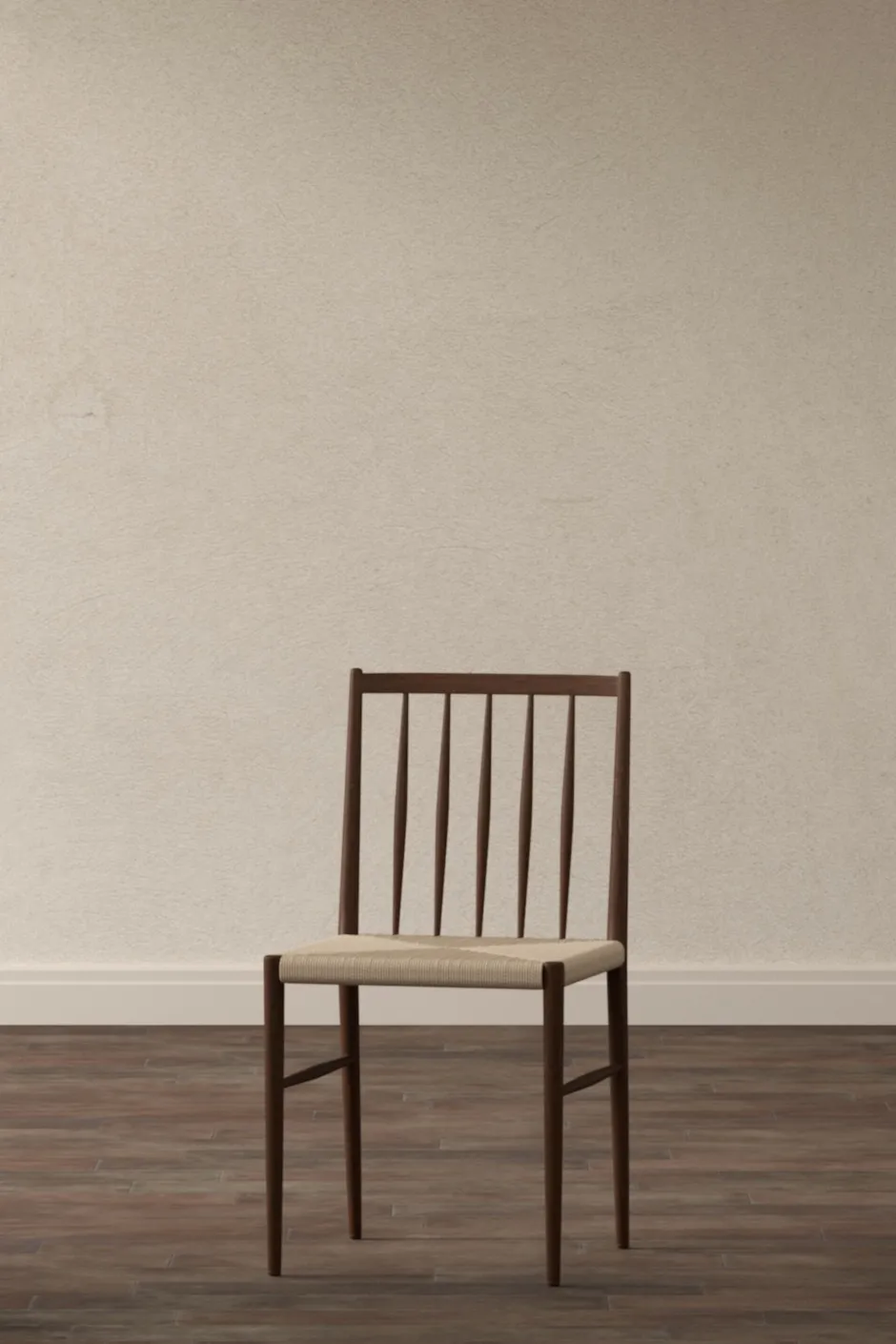 Evangela is een tijdloze eetkamerstoel die een warme houttint combineert met een zitting van geweven beige touw. De elegante rugleuning met slanke spijlen geeft de stoel een lichte en luchtige uitstraling, perfect voor zowel moderne als traditionele interieurs.